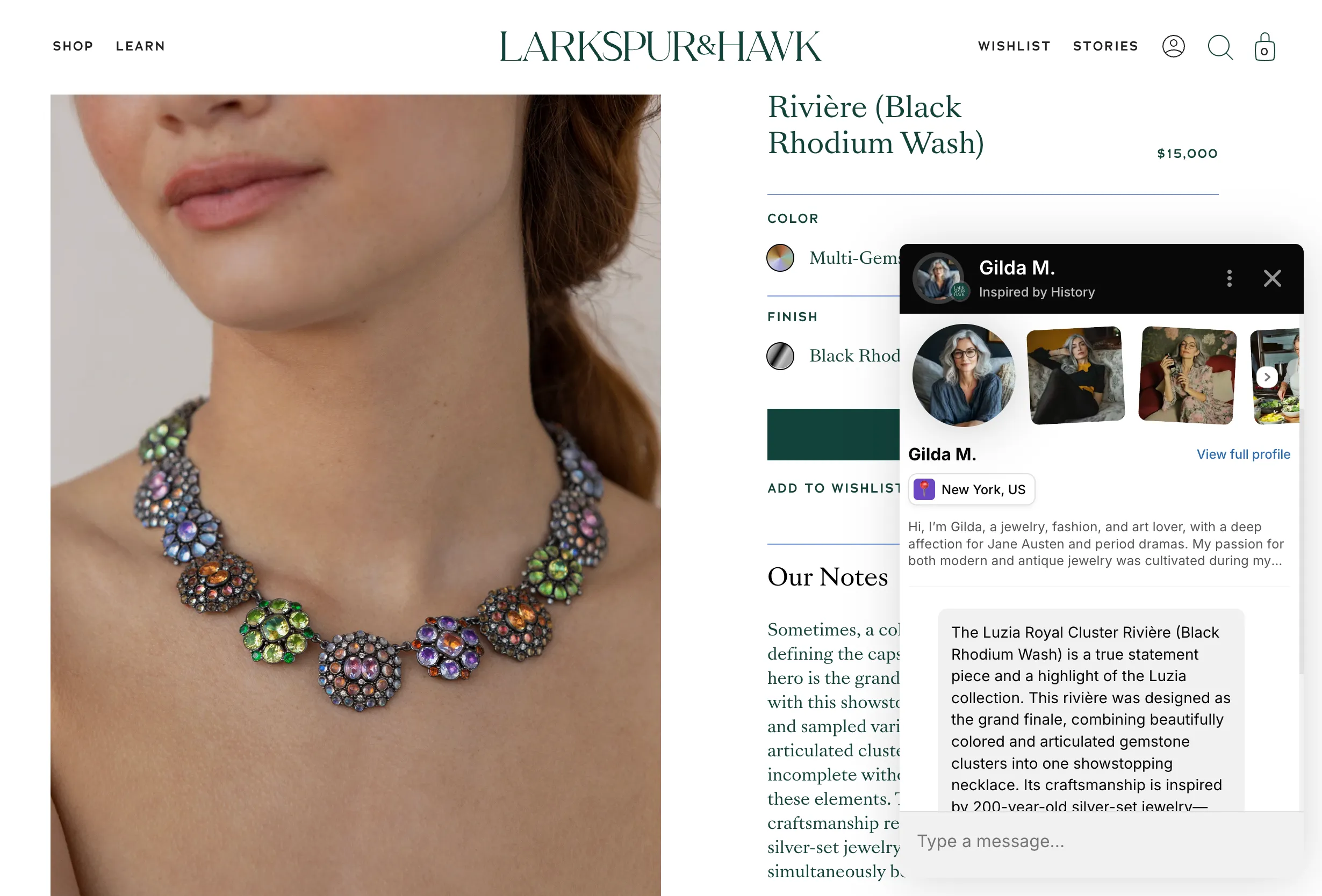 Whether someone is comparing two hues of topaz, searching for the perfect necklace for a special occasion, or wondering how a pair of earrings will feel for all-day wear, Remark provides clarity at exactly the right moment. The guidance feels effortless, personal, and distinctly Larkspur & Hawk, helping each visitor move from curiosity to confidence without interrupting their shopping experience.