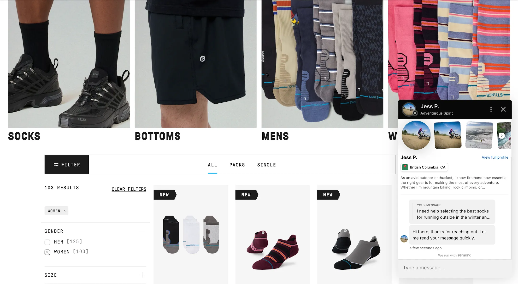 Stance brings Remark into the fold to offer real-time guidance right where shoppers need it most. Whether someone is exploring the difference between lightweight and mid-cushion socks, comparing fabric blends, or building a full look, help is always just a click away. Every interaction feels natural and on-brand — not like a chatbot, but like a knowledgeable member of the Stance crew, ready to guide shoppers every step of the way. By keeping support intuitive and conversational, Remark helps shoppers stay immersed in discovery instead of scrolling aimlessly, detouring to FAQs, or abandoning their carts.